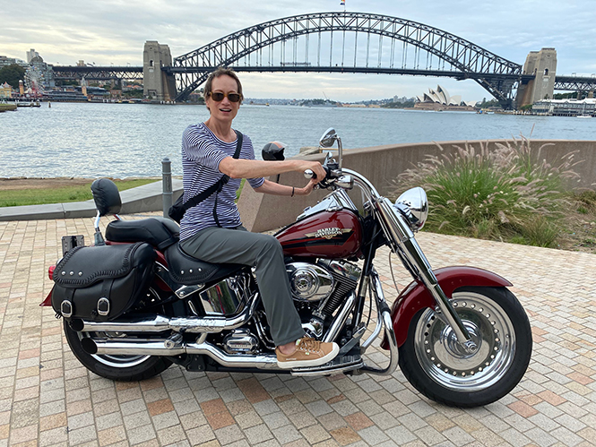 Secondly, they rode on through Milsons Point, did a left hand turn and rode up a few streets. This leads to Blues Point Reserve. The views over Blues Bay towards the Sydney Opera House, the Harbour Bridge and the CBD are just stunning. Already, the Sydney Harley fun ride has shown Jackie some major Sydney city sights. It’s where the photo was taken.